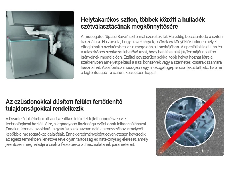 • Helytakarékos szifon, többek között a hulladék szétválasztásának megkönnyítésére